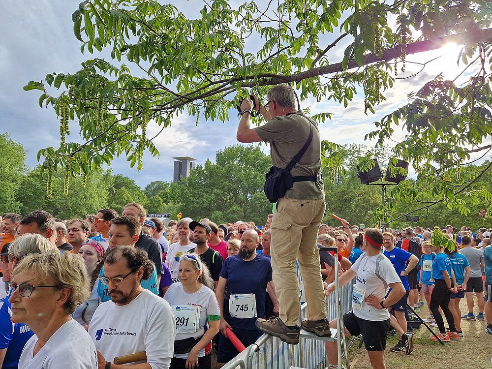 Trotz der sorgfältigen Planung muss er während des Events flexibel sein. Zwar hat er einige feste Motive im Kopf – etwa den Startbereich oder die Staffelstabübergaben, die jedes Jahr aufs Neue spannend zu fotografieren sind –, doch die äußeren Bedingungen verändern sich stets. Besonders das Licht spielt im Tiergarten eine große Rolle. Je nach Tageszeit und Wetter wirft die tief stehende Sonne lange Schatten, oder der Himmel ist bedeckt, was, wie an diesem Tag, das Fotografieren erschwert. Der Wechsel von Licht, Schatten und auch Regen unter den Bäumen schafft komplexe Lichtsituationen, die große Herausforderungen darstellen und genau das reizt ihn. Auch besondere Szenen, wie etwa kurz bevor ein Regenschauer niedergeht und sich das Licht dramatisch verdunkelt, sucht er gezielt, denn sie erlauben atmosphärisch dichte Bilder. Wer sich mal an die Sohlen Wiedersohlers heftet, der macht Kilometer. Immer wieder pirscht der Fotograf über das Gelände, die Kameras bereit, mit den Augen das Gelände nach dem nächsten Schnappschuss abscannend. In diesem Jahr gab es bei den Staffel-Tagen erstmals Medaillen, ein weiteres Motiv mit reichlich Potential.