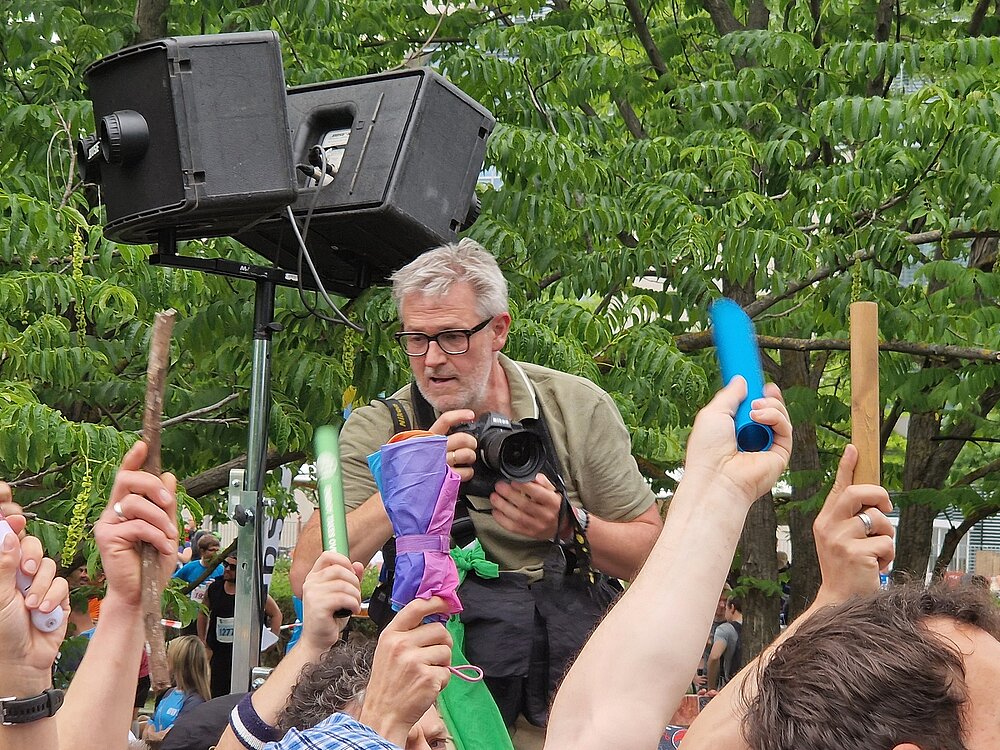 Was seine Motivwahl betrifft, liegt sein Fokus weniger auf dem Publikum. Anders als bei klassischen Profi-Laufevents gibt es hier weniger ekstatischen Jubel – viele der Zuschauenden warten eher konzentriert auf ihren Lauf-Einsatz. Der Zieleinlauf reizt ihn persönlich nicht besonders, auch wenn dieses Motiv vom Organisator gerne als typisches Bild gewünscht wird. An diesem Tag fanden als Sieger:innen auf das Bild: Die adidas Runners - BBF 1 in 1:43:06 Stunden bei den Frauen sowie die adidas Runners - BBF 2 in 1:24:08 Stunden bei den Männern.